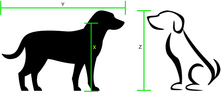 Nejlépe si změřit psa. X je výška psa v kohoutku a určuje velikost otvoru vchodu a šířku prostoru na spaní, hodnota Y je délka psa, určuje délku spacího prostoru, a hodnota Z určuje výšku psa, od které se odvíjí výška prostoru boudy. K hodnotám si přičtěte 5-10 cm, a máte velikost spacího prostoru, K té pak přičtěte velikost vstupního prostoru - většinou šířka psa a máte velikost boudy.
